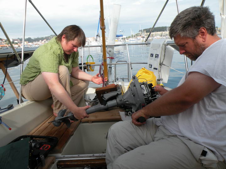 Dann holt Annika Julia von Land ab. Im Cockpit zerlegt Stefan den Außenborder in seine Einzelteile, um alles Salzwasser zu entfernen. Jede Schraube und jeder Hohlraum wird in Spiritus gebadet und anschließend mit einer Schicht WD-40 überzogen. Annika hat heute Technikunterricht :-).