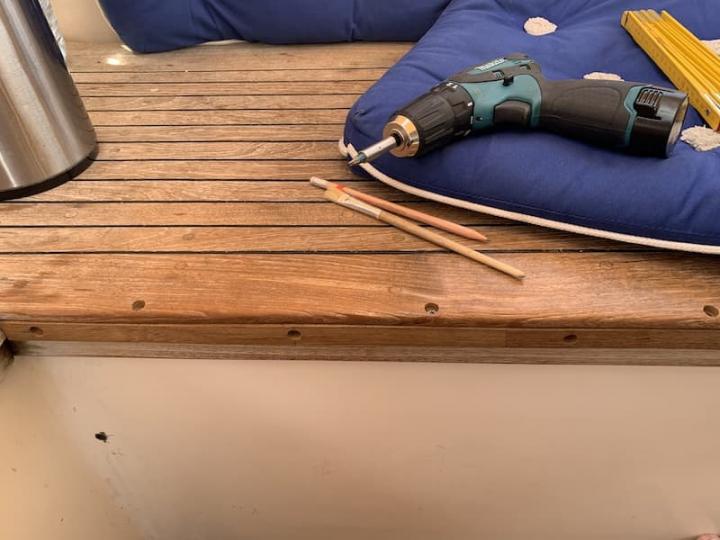 Der Kptn. will heute seine zusammengestückelte Teakleiste unter das Sitzbankbrett schrauben und kleben. Diesmal geht es sogar ohne viel Schmierkram ab. Das liegt wohl da dran, dass wir ziemlich viel Zeit haben – kein „ich mach mal eben schnell“. Die Leiste ist fixiert und klebt. Morgen wird sie weiterbearbeitet und abgeschliffen.
